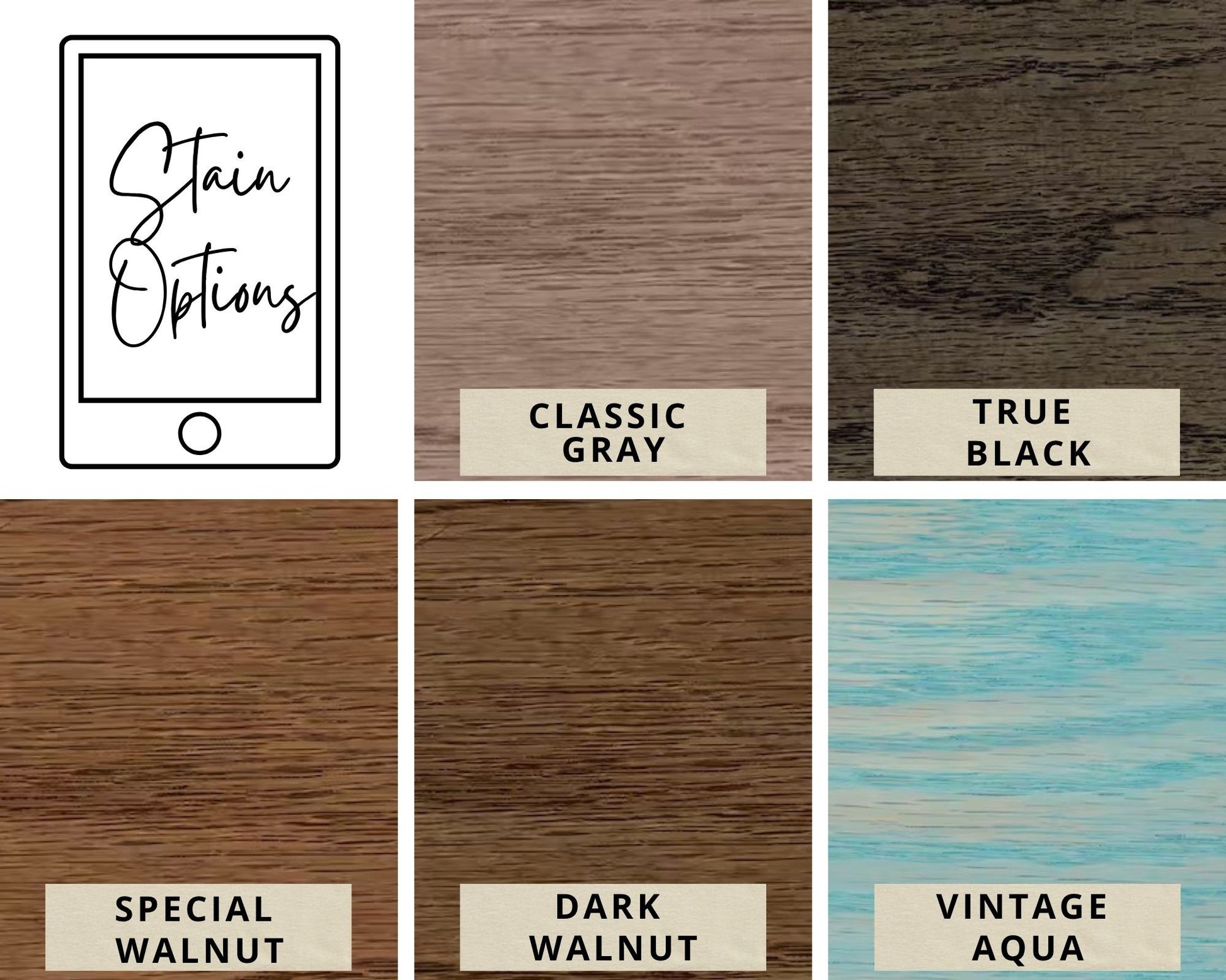 - Stain options: Light, Medium, Dark Walnut, and Gray Wash